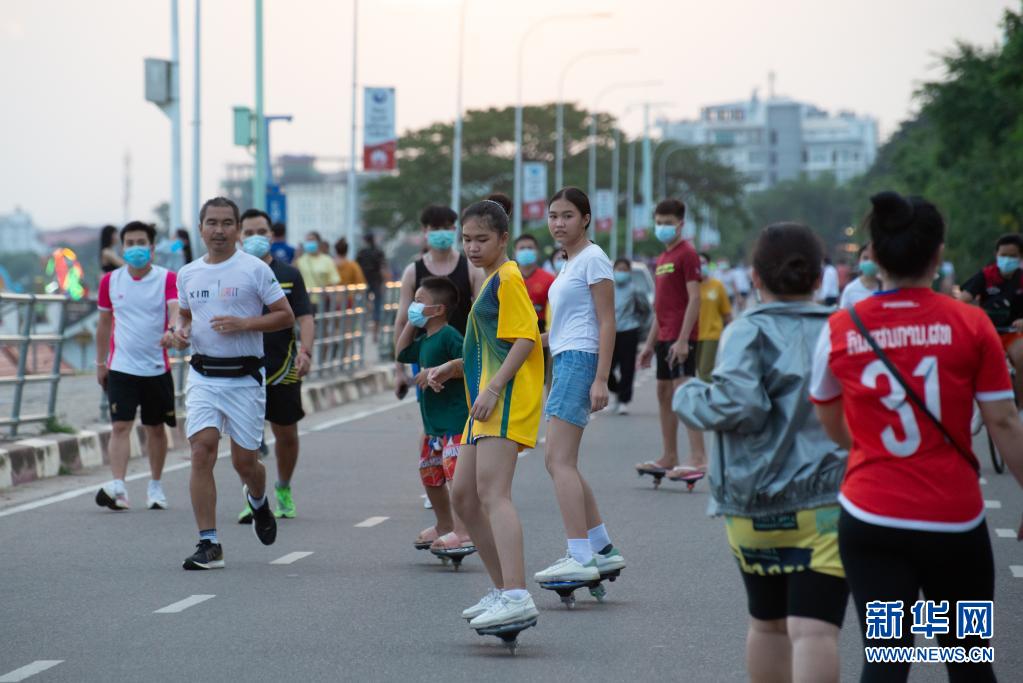 7月5日,人们在老挝万象湄公河边进行室外活动。新华社发(凯乔摄)