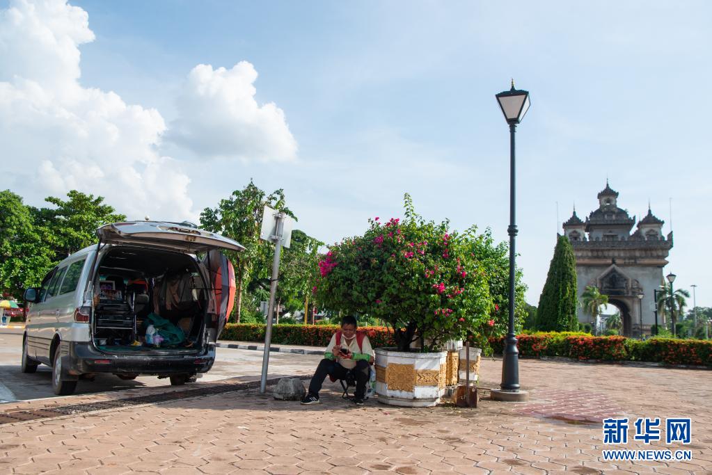 7月5日,一名摄影师在老挝万象的凯旋门公园等待游客。新华社发(凯乔摄)