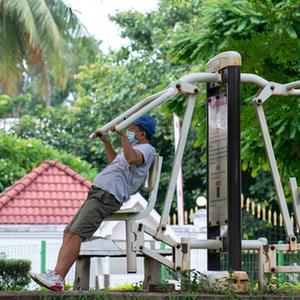 7月5日,一名市民在老挝万象一处公园内戴着口罩锻炼。新华社发(凯乔摄)