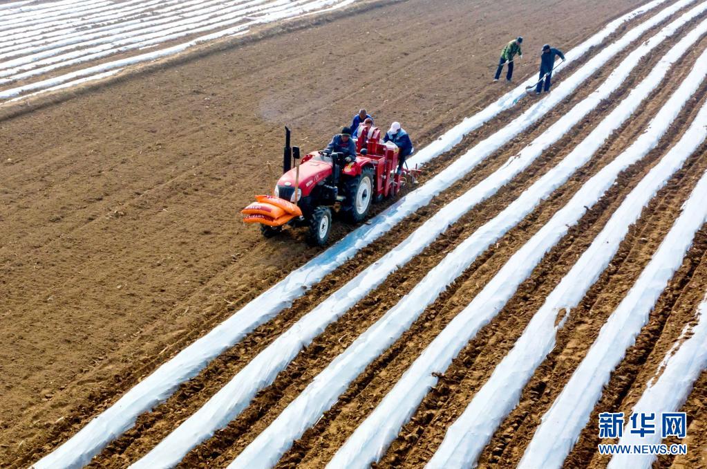 3月9日,河北省武安市淑村镇白沙村村民在播种土豆(无人机照片)。