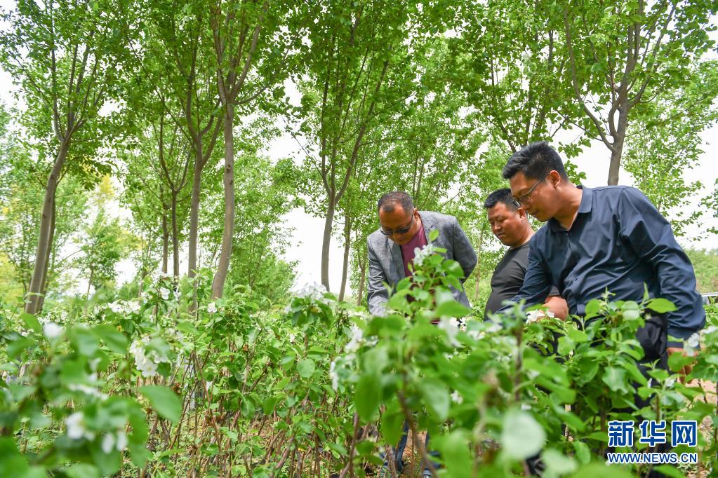 5月20日,吉林省四平市铁东区叶赫满族镇英额堡村党总支书记胡成君(左一)、驻村第一书记马全(右一)和驻村工作队队员查看村中果树种植情况。