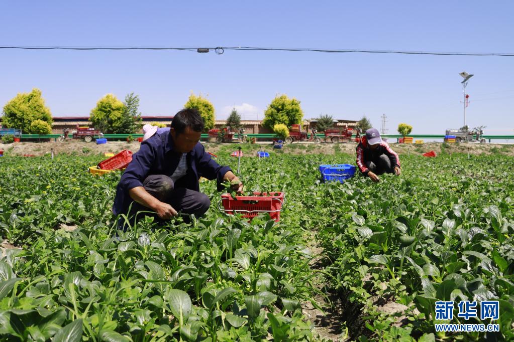7月4日,在甘肃省张掖市甘州区乌江镇供港蔬菜基地,当地群众在采摘蔬菜。