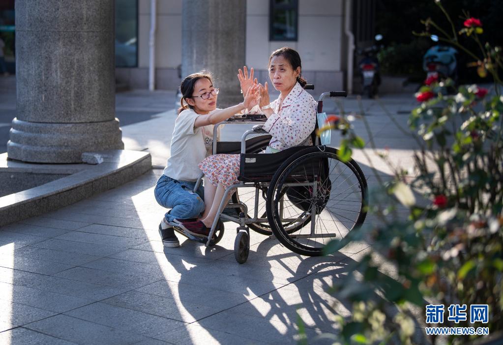 杨竹梅陪着母亲在医院的走廊上做游戏(6月22日摄)。新华社记者 陶明 摄