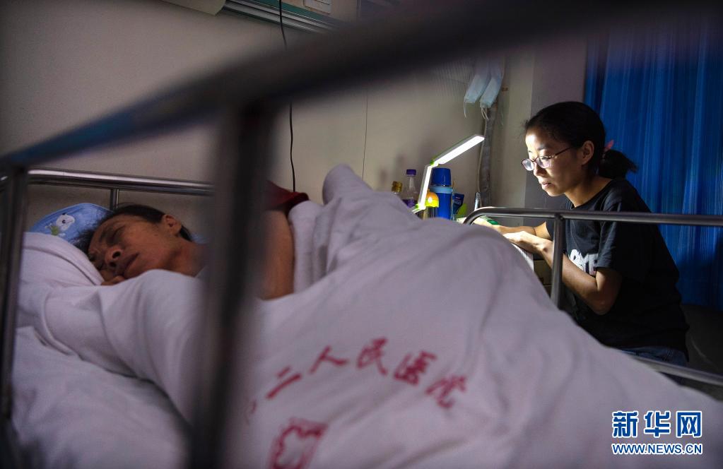 母亲入睡后,杨竹梅在台灯下学习(6月23日摄)。新华社记者 陶明 摄