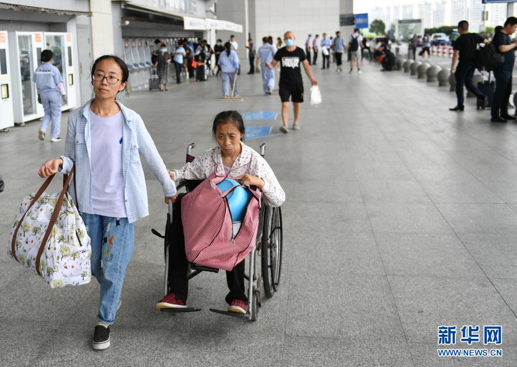 杨竹梅(左)带着母亲从合肥南站出发,准备去上海一家医院诊疗(6月29日摄)。新华社发(余康生 摄)