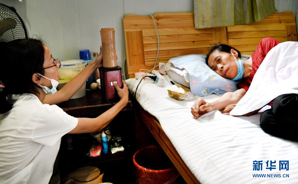 杨竹梅在出租房里用榨汁机给母亲准备流食(6月5日摄)。因为母亲有吞咽功能障碍,这几年不管去哪里,杨竹梅都带着这个榨汁机。新华社发(余康生 摄)