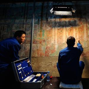 敦煌研究院技术人员在莫高窟98窟内对病害壁画进行修复(2014年9月3日摄)。新华社记者 陈斌 摄