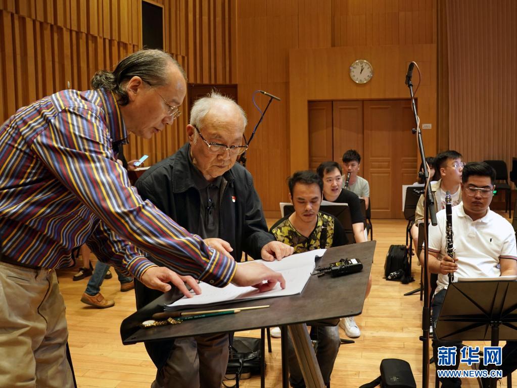 6月9日,吕其明(左二)在上海爱乐乐团录制管乐版《红旗颂》的现场,与指挥林友声讨论乐谱。