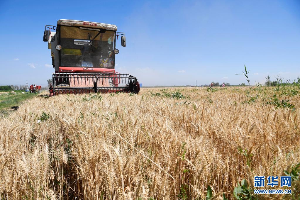近日,宁夏引黄灌区小麦陆续成熟,进入收获期,各地农民紧抓晴好天气开展夏收作业。