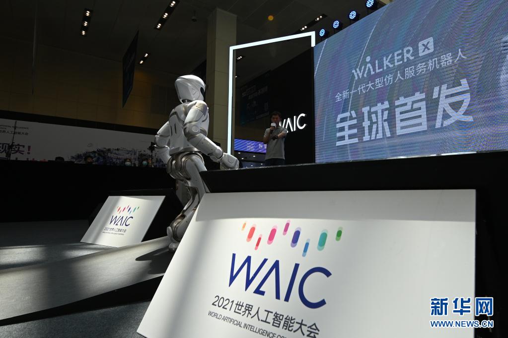 这是7月7日在世界人工智能大会体验日拍摄的大型仿人服务机器人。