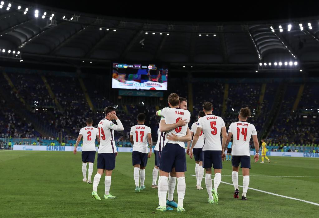 7月3日,英格兰队球员亨德森(前右)在比赛中与队友凯恩(前左)拥抱庆祝进球。当日,在意大利罗马进行的欧洲足球锦标赛四分之一决赛中,英格兰队以4比0战胜乌克兰队,晋级四强。新华社记者程婷婷摄