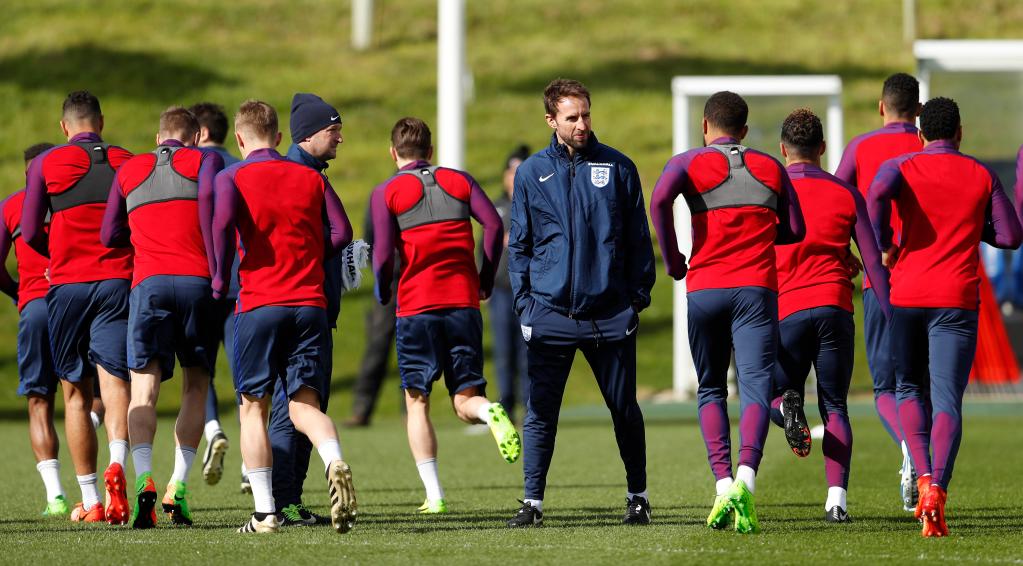 2017年3月22日,英格兰队主教练索斯盖特(中)带队在圣乔治公园进行训练。