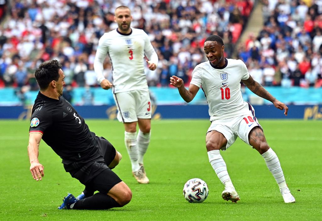 6月29日,英格兰队球员斯特林(右)与德国队球员胡梅尔斯(左)拼抢。