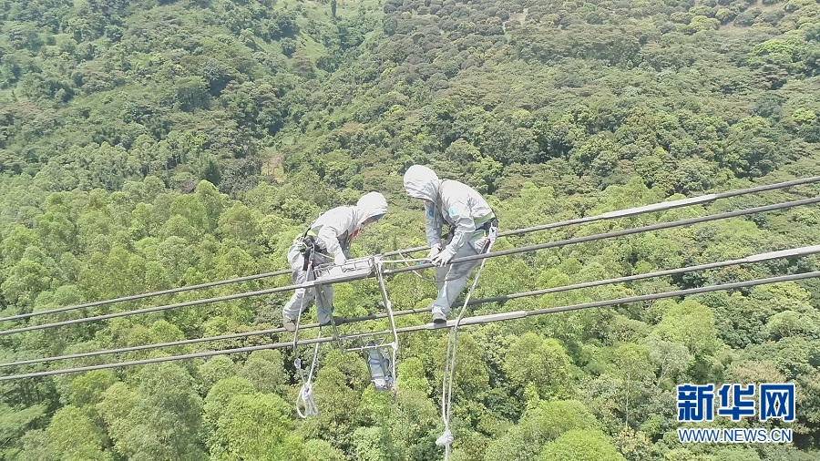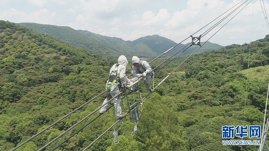 广东持续高温,进入“烧烤模式”,电网全面进入高温高负荷的“迎峰度夏”模式。为保证大湾区电力供应,南方电网超高压公司广州局将原本需要停电开展的工作改为带电作业,对500千伏输电线路开展带电检测,确保南方电网西电东送大通运行稳定,“电”凉夏日。工作人员带电高空作业。新华网发
