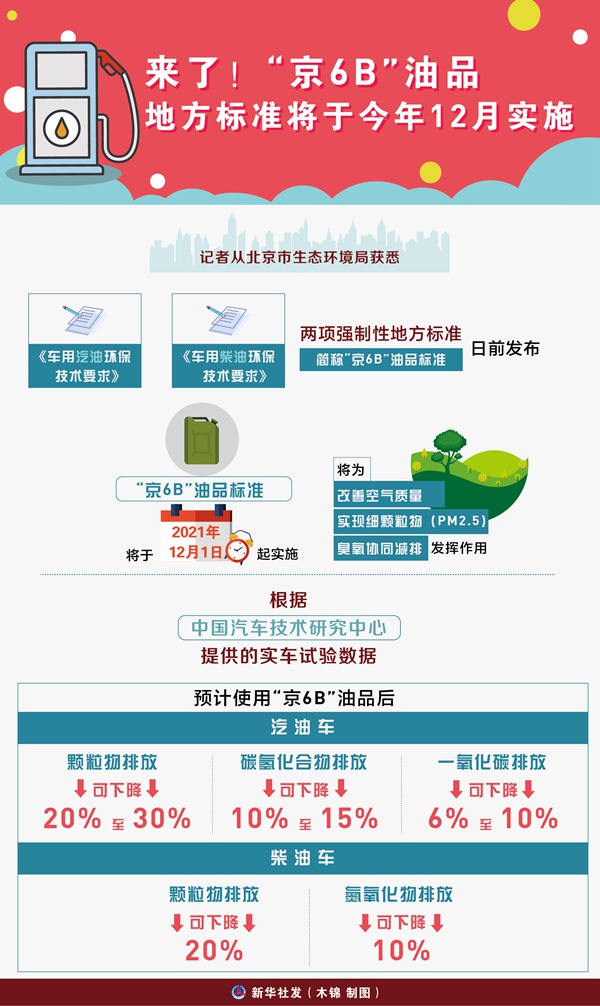 新华社北京7月9日电(记者倪元锦)记者从北京市生态环境局获悉,《车用汽油环保技术要求》《车用柴油环保技术要求》两项强制性地方标准(简称“京6B”油品标准)日前发布,“京6B”油品标准将于2021年12月1日起实施,将为改善空气质量、实现细颗粒物(PM2.5)和臭氧协同减排发挥作用。