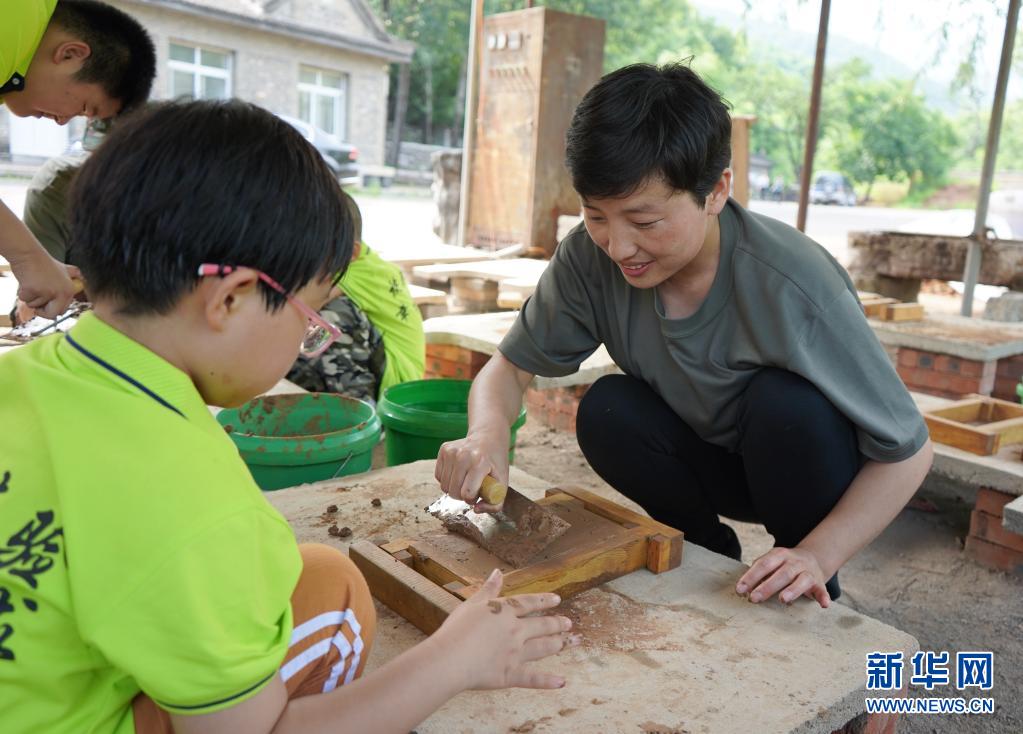 7月8日,在秦皇岛市海港区的板厂峪风景区,李翠与参加长城文化体验的孩子一起做手工。新华社记者 金皓原 摄