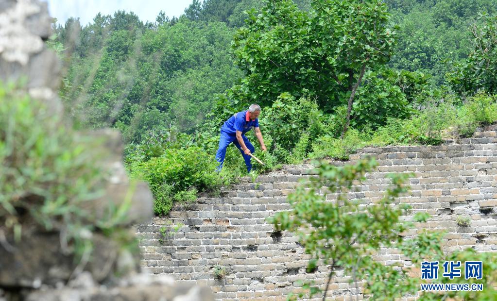7月7日,在秦皇岛市海港区的城子峪长城,张鹤珊在清除杂草。新华社记者 金皓原 摄