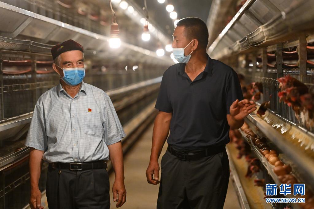 在新疆伊宁县温亚尔镇布力开村玉林禽蛋养殖专业合作社,买买提江·吾买尔(左)与养殖户交流(6月12日摄)。新华社记者 丁磊 摄