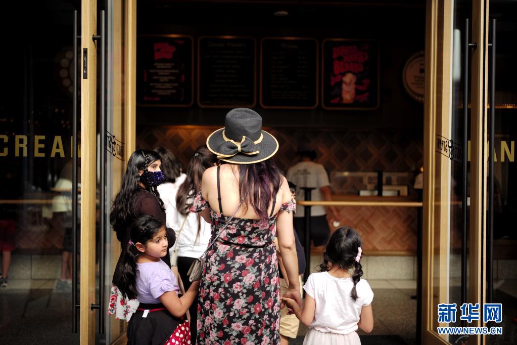 7月10日,在美国旧金山湾区城市圣拉蒙一个购物中心,人们排队购买冰激凌。