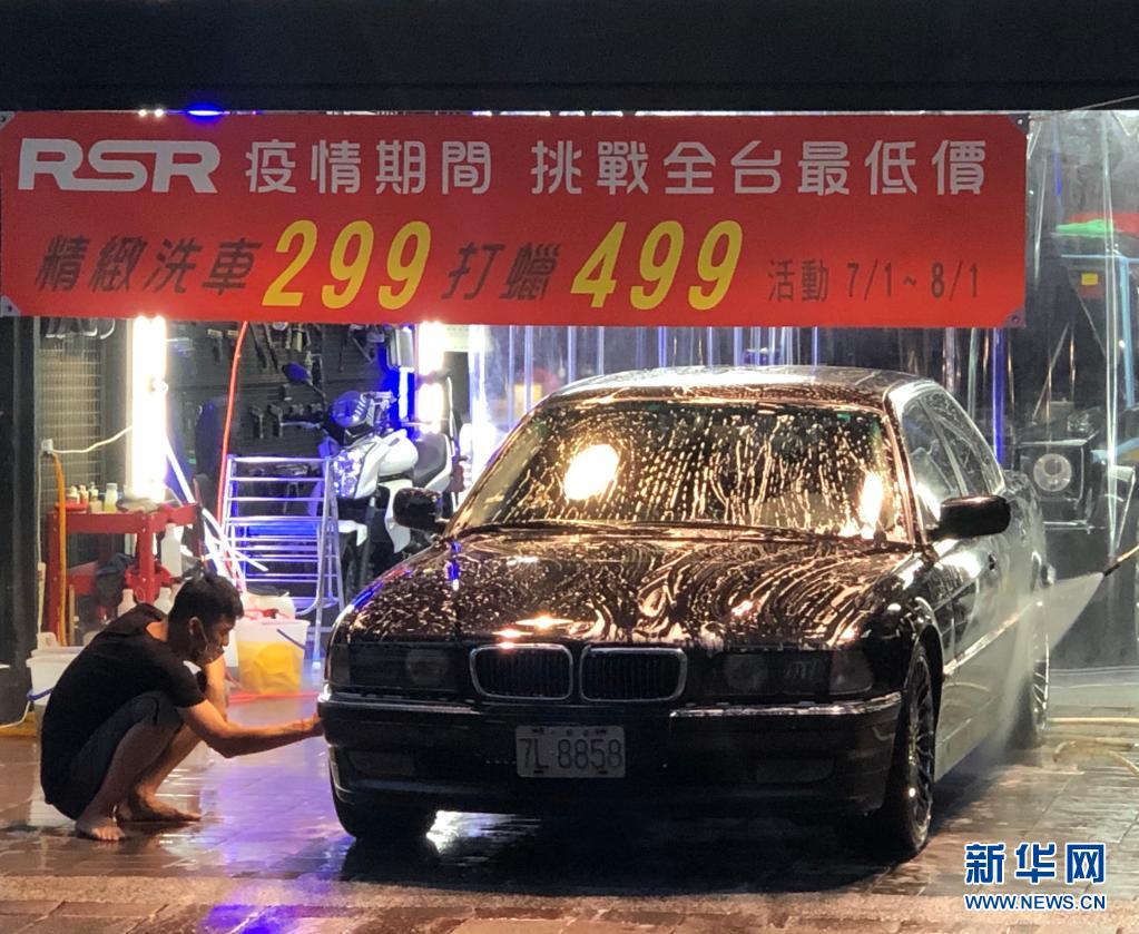 疫情三级警戒下,台湾百业萧条。一家洗车店推出优惠活动招揽顾客。新华社记者 姜婷婷 摄