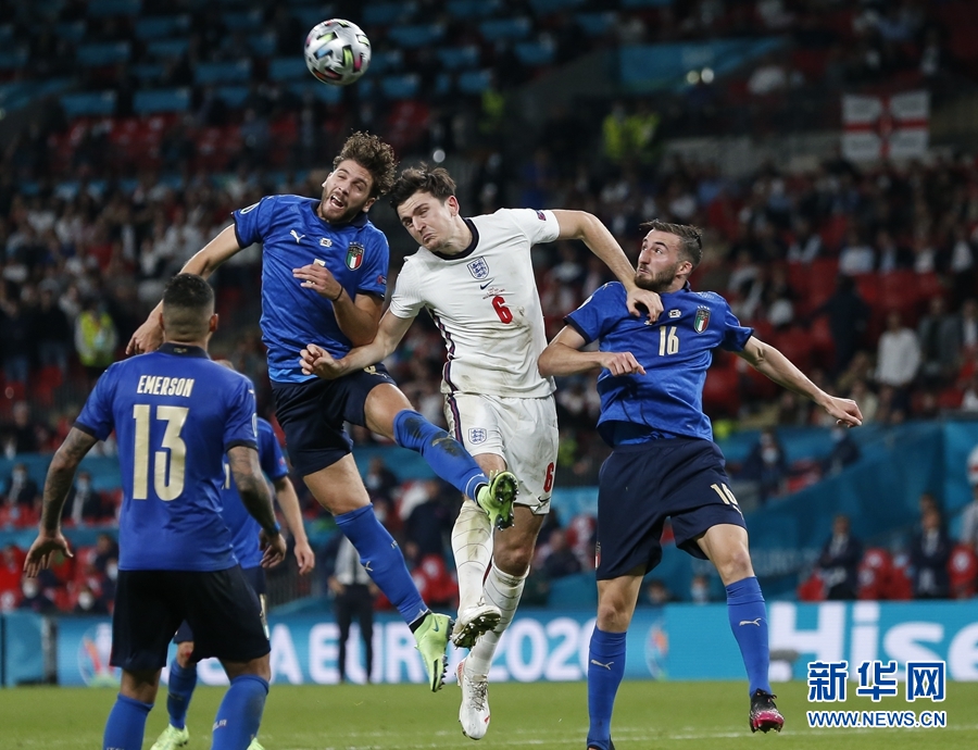 7月11日,意大利队球员洛卡特利(左二)与英格兰队球员马奎尔(右二)在比赛中拼抢。新华社记者 韩岩 摄