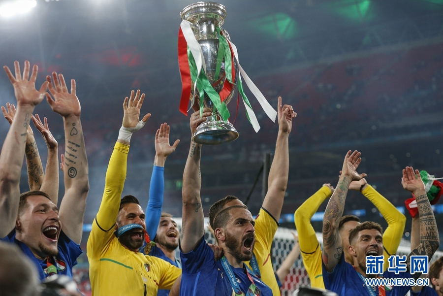 7月11日,意大利队球员举起奖杯庆祝夺冠。新华社记者 韩岩 摄