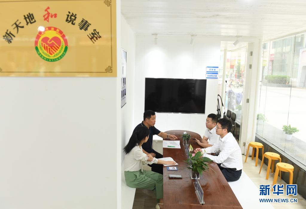 “道德医生”(左上)和驻站律师(左下)为辖区某商业中心物业工作人员提供政策法规咨询(5月18日摄)。浙江湖州吴兴区爱山商圈商贸调解中心于今年4月挂牌运行。该中心承担辖区内法治宣传、公共法律服务和矛盾纠纷调处等工作,配有站长、律师、“道德医生”等,并与社区网格站、市场监管所、行政执法中队等联合驻站,服务周边商贸企业和常住居民,力求打通基层治理“神经末梢”。 新华社记者 翁忻旸 摄