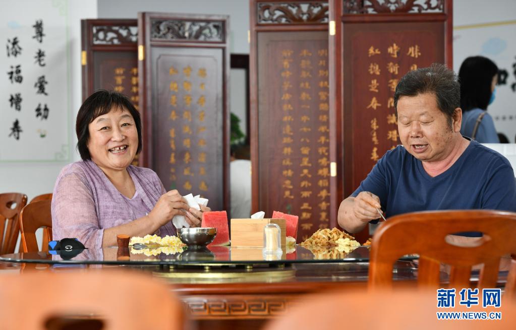 老人在天津市西青区精武镇付村康养中心(老人家食堂)准备用餐(2020年7月7日摄)。 新华社记者 李然 摄