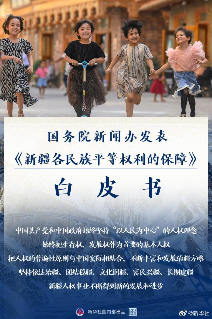 国务院新闻办14日发表《新疆各民族平等权利的保障》白皮书。白皮书介绍,70多年来,中国共产党和中国政府始终坚持“以人民为中心”的人权理念,始终把生存权、发展权作为首要的基本人权,把人权的普遍性原则与中国实际相结合,不断丰富和发展治疆方略,坚持依法治疆、团结稳疆、文化润疆、富民兴疆、长期建疆,新疆人权事业不断得到新的发展和进步。(记者王子铭、王琦;海报设计贾伊宁)
