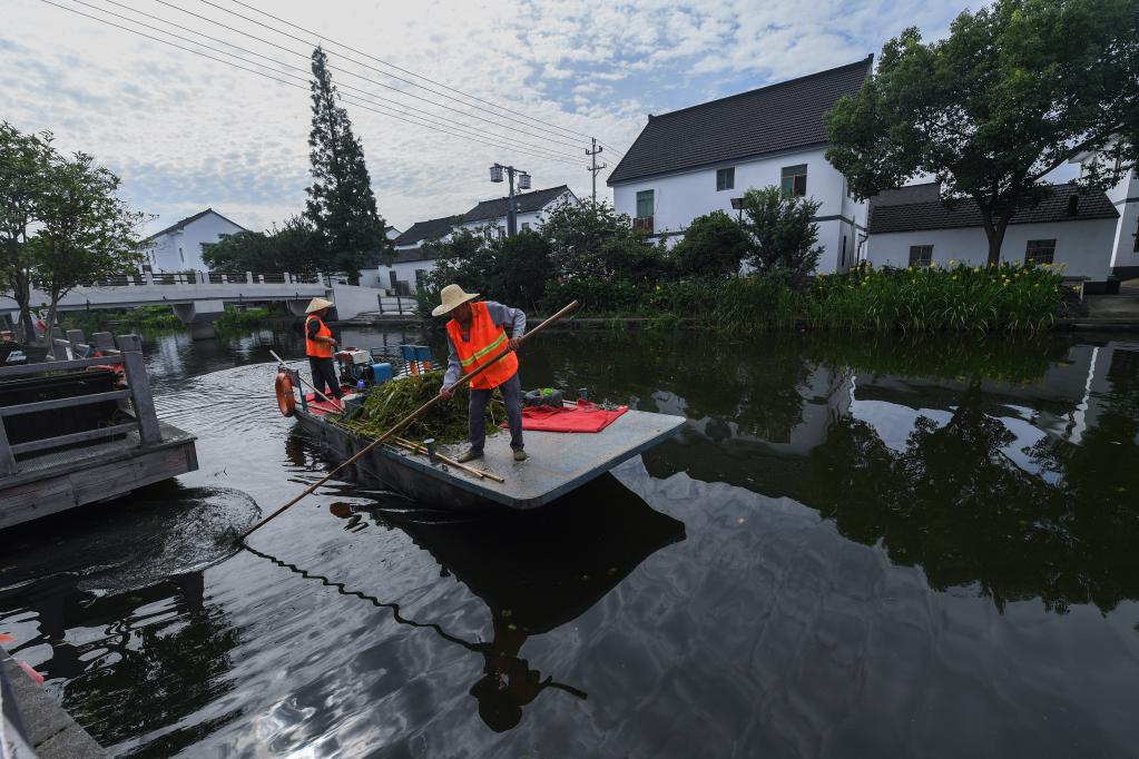 7月13日,嘉善县姚庄镇横港村的保洁人员在清理河道漂浮物。新华社记者 徐昱 摄
