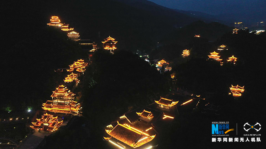 夜色中的九黎城“九道门”。九道门沿着山脊建造的,远看宏伟壮观,每座牌门建筑错落有致,造型各异,是九黎城的标志性建筑。新华网 向进 摄 韩梦霖 文