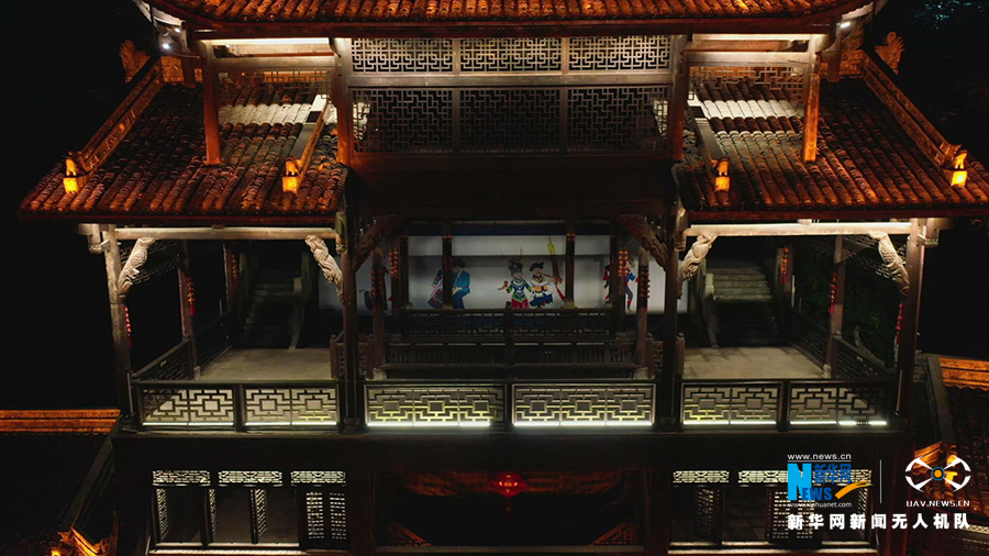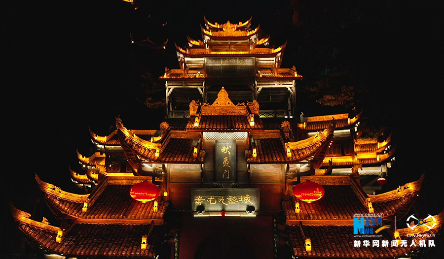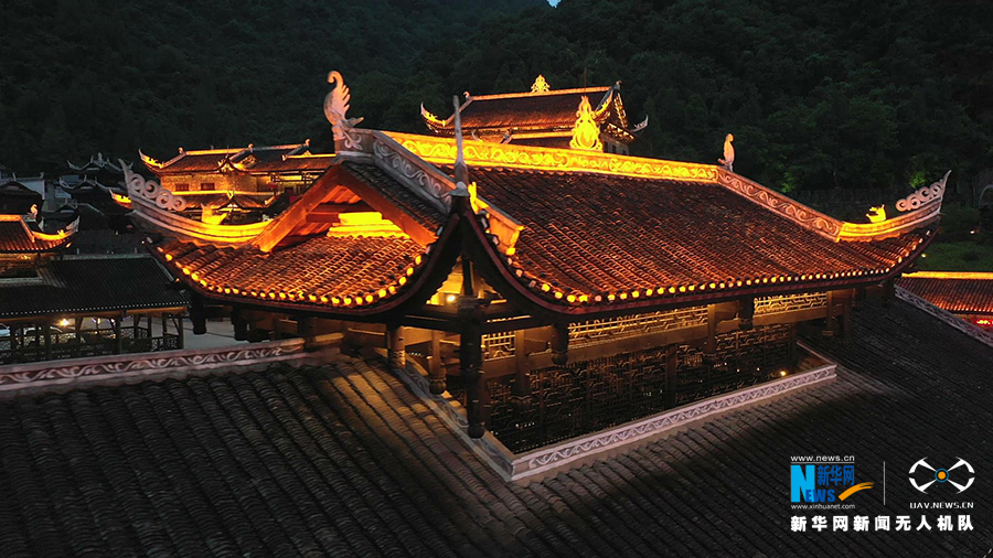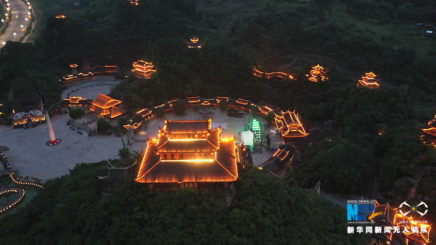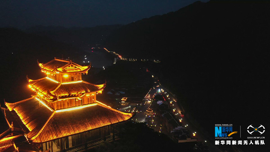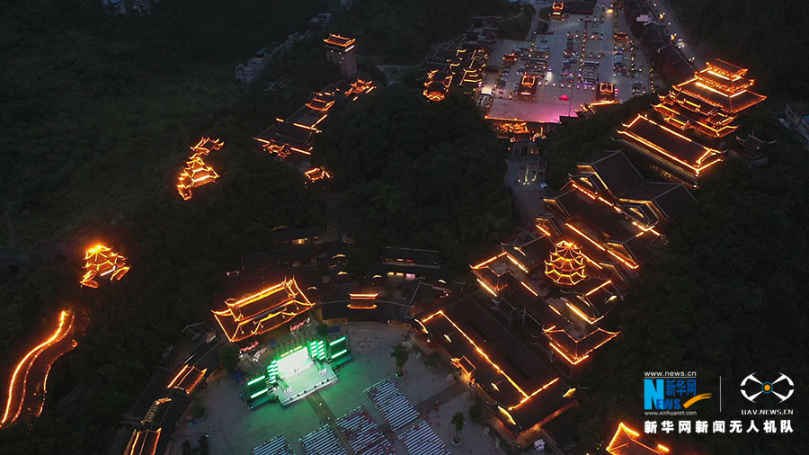 位于重庆市彭水苗族土家族自治县的蚩尤九黎城,是当地深入挖掘文化内涵,依山就势打造的大型苗族建筑群落,也是展示和传承苗族文化的窗口和基地,彰显着浓郁的苗家烟火气息。每年踩花山节期间,当地都会在此举办万人同唱娇阿依、共舞踩花山的民俗文化活动,这里已成为彭水自治县一张闪亮的城市名片以及渝东南乌江旅游线路上的一颗璀璨明珠。每当夜幕降临,无人机视角下的蚩尤九黎城,重楼叠宇,七彩流光,飞檐琉瓦,气势恢宏,犹如“天上的宫宇”,时尚彩灯和传统吊脚楼碰撞在一起,演绎出最美民族风。新华网 向进 摄 韩梦霖 文