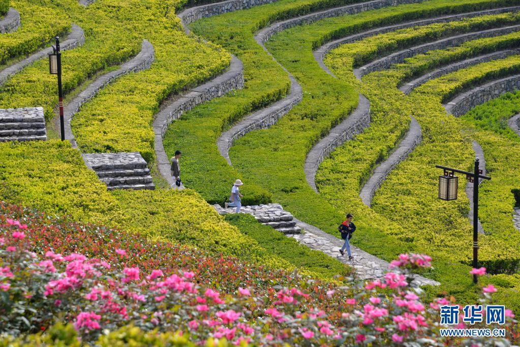 7月15日,人们行走在贵州毕节大方县奢香古镇的花海梯田间。