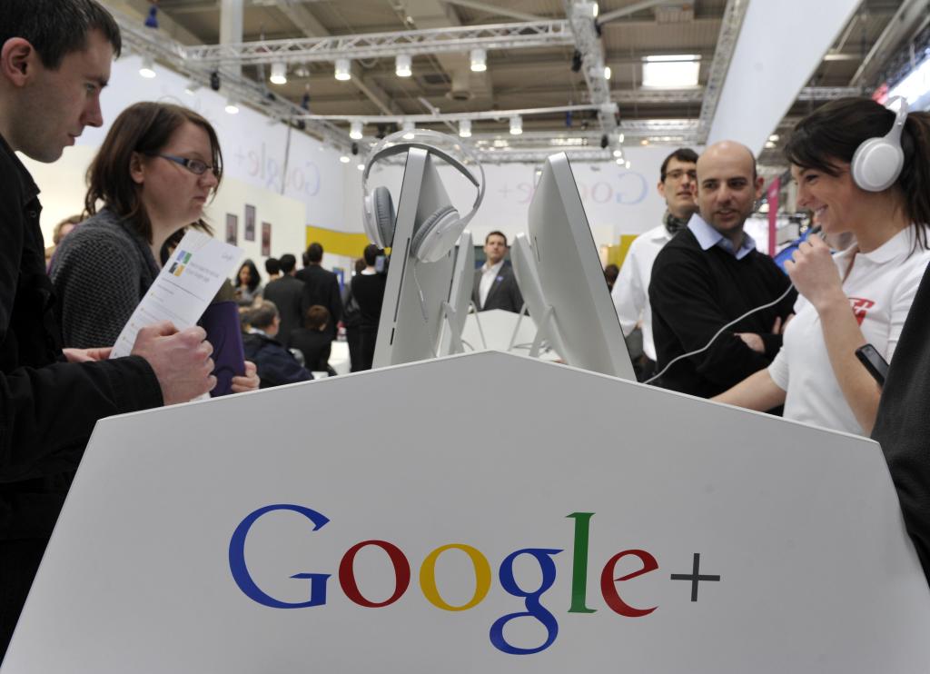 2012年3月6日,在德国汉诺威会展中心举行的汉诺威信息及通信技术博览会上,参观者在谷歌展台参观。新华社记者马宁摄