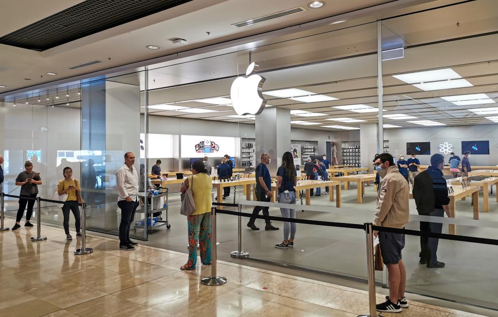 2020年5月8日,在澳大利亚悉尼一家商场,顾客在重新营业的苹果专卖店外排队。新华社记者白雪飞摄