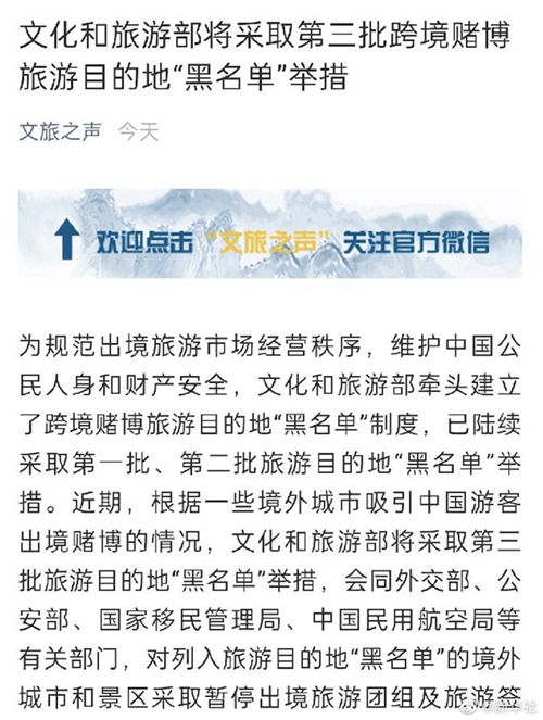 记者16日从文化和旅游部获悉,近期,根据一些境外城市吸引中国游客出境赌博的情况,文化和旅游部将采取第三批旅游目的地“黑名单”举措,会同外交部、公安部、国家移民管理局、中国民用航空局等有关部门,对列入旅游目的地“黑名单”的境外城市和景区采取暂停出境旅游团组及旅游签证代办业务等限制措施。据悉,为规范出境旅游市场经营秩序,维护中国公民人身和财产安全,文化和旅游部牵头建立了跨境赌博旅游目的地“黑名单”制度。根据境外有关城市针对中国游客招赌吸赌情况的变化,文化和旅游部将会同有关部门对旅游目的地“黑名单”进行动态调整。(记者余俊杰)