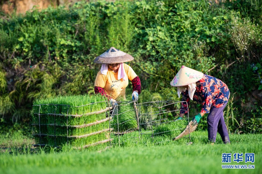 7月14日,湖南省湘乡市育塅乡南水村的村民在起秧苗。新华社记者 陈思汗 摄