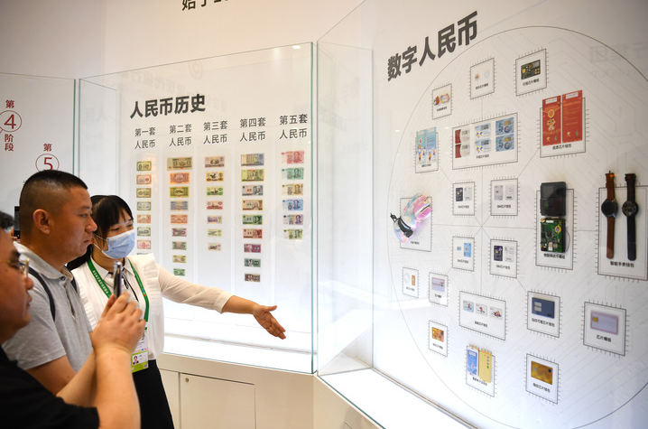 在首届中国国际消费品博览会上,多家银行推出数字人民币体验活动专区,方便参会者了解数字人民币的特点并体验其多种使用场景。图为观众在了解数字人民币特点。新华社记者 郭程 摄