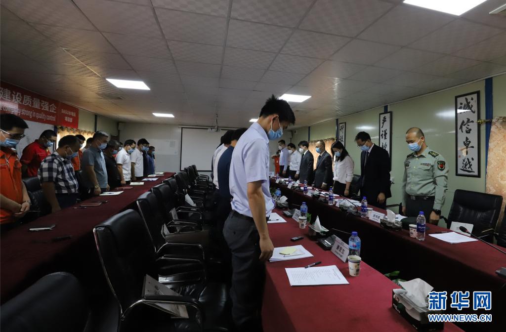 7月17日,中国赴巴基斯坦跨部门联合工作组组长、外交部涉外安全司副司长吴伟(前排左五)与中国驻巴大使农融(前排左四)带领现场人员集体肃立默哀。新华社记者 蒋超 摄