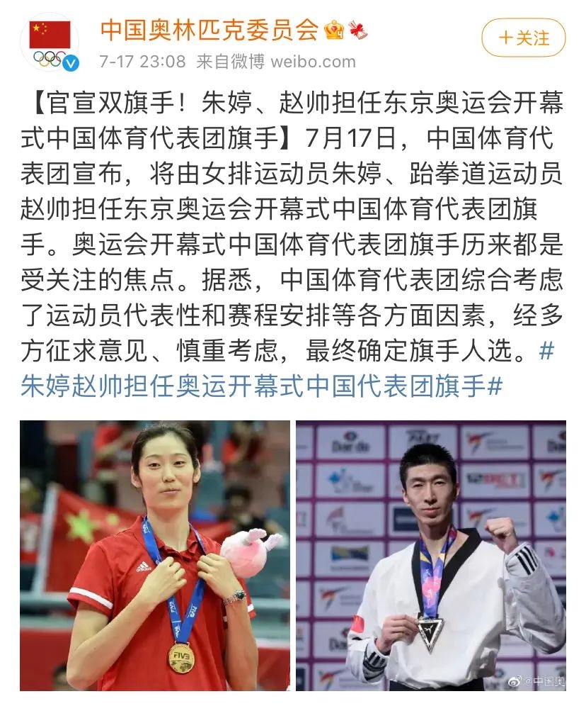 17日晚,中国体育代表团宣布,将由女排运动员朱婷、跆拳道运动员赵帅担任东京奥运会开幕式中国体育代表团旗手。