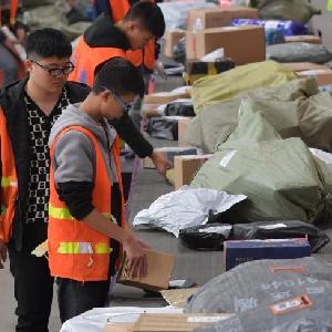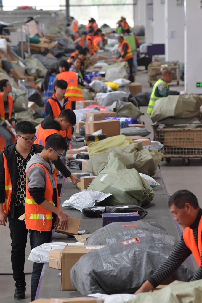 在圆通速递公司南昌转运中心,工作人员正在流水线上分拣快递包裹。新华社记者 彭昭之 摄
