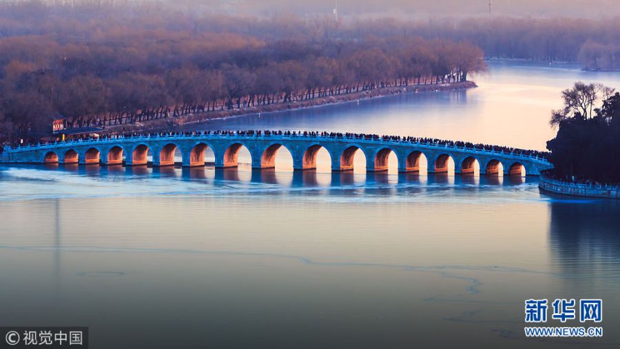 2017年12月21日,北颐和园十七孔桥金光穿洞。新华网发(图片来源:视觉中国)