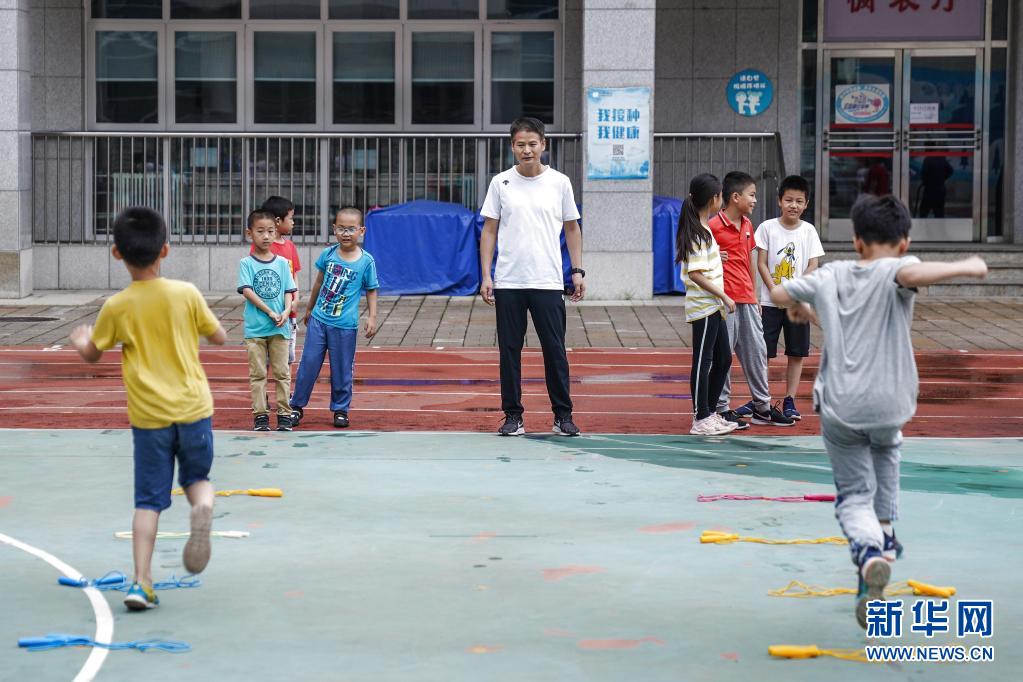 7月19日,在北京小学广外校区,教师带领孩子开展室外体育活动。