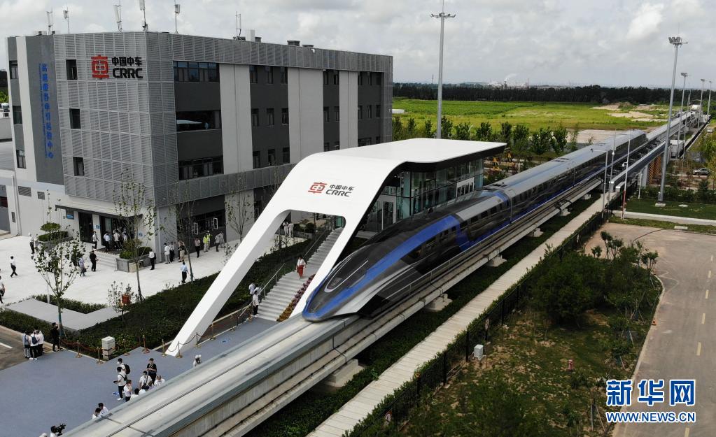 这是7月20日在山东青岛拍摄的时速600公里高速磁浮交通系统(无人机照片)。新华社记者 李紫恒 摄