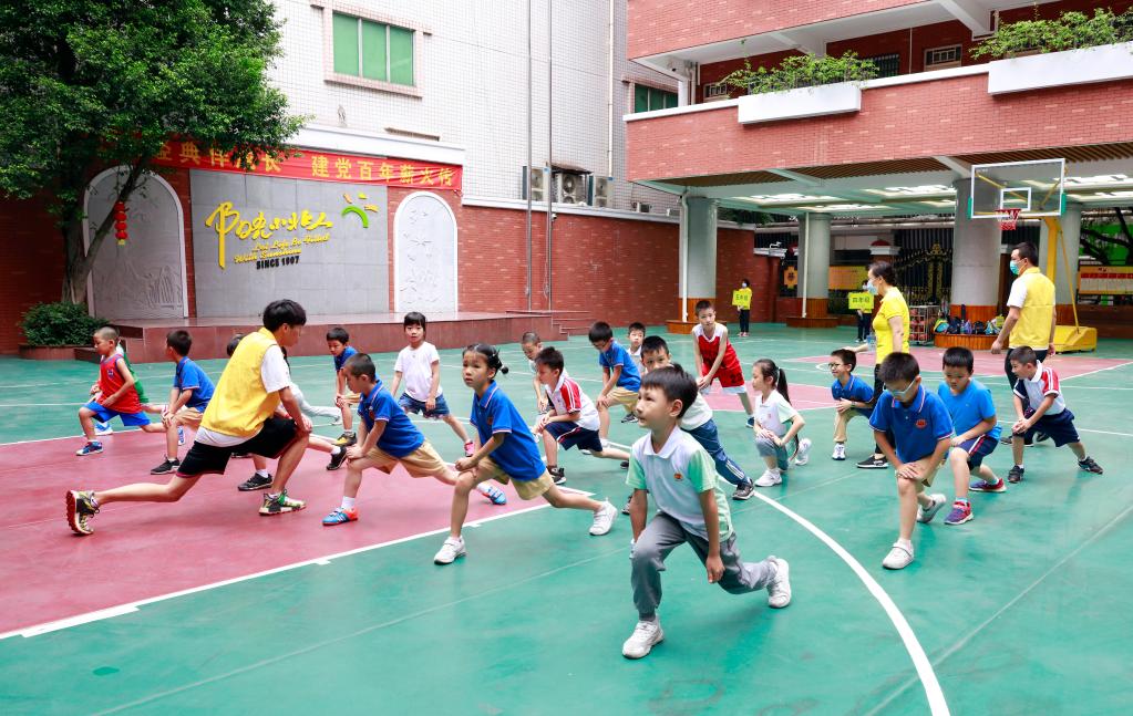 7月19日,广州越秀区小北路小学开展校内托管服务,孩子们在进行篮球热身运动。 新华社记者 黄国保 摄