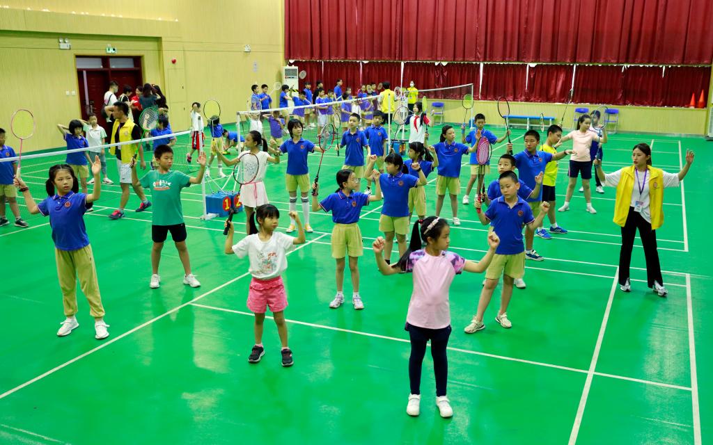 7月19日,广州越秀区小北路小学开展校内托管服务,孩子们在上羽毛球课。 新华社记者 黄国保 摄