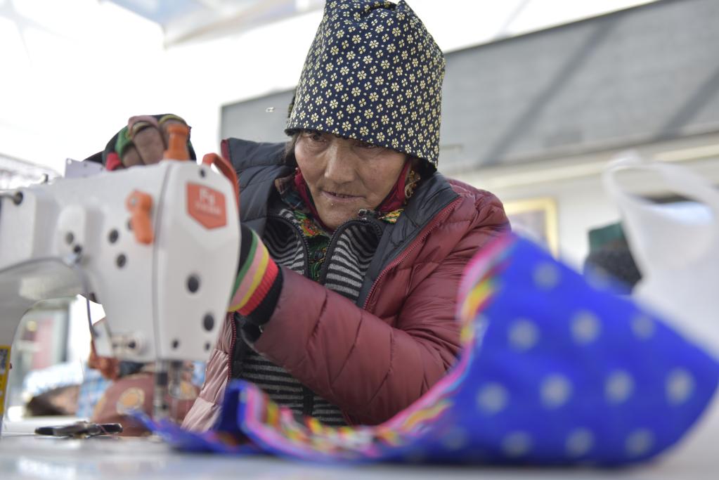 在民族服装缝纫制造农民专业合作社里,拉卓正在缝制产品(2021年2月2日摄)。 新华社记者田金文 摄