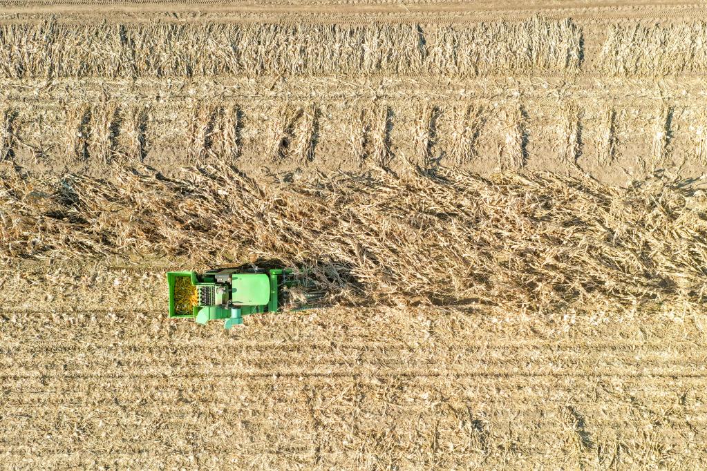 2020年10月27日,吉林省舒兰市溪河镇松凤村农民收割倒伏玉米,并将部分地块玉米秸秆粉碎还田。新华社记者张楠 摄