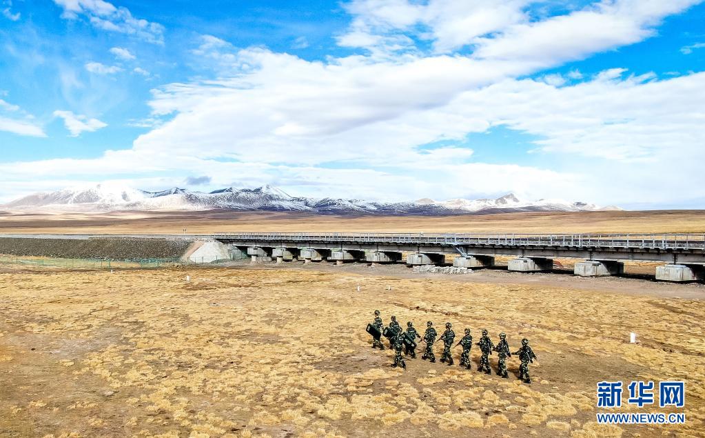武警青海总队执勤支队执勤七中队官兵在青藏铁路沿线巡逻(5月21日摄)。新华社发(杨浩 摄)