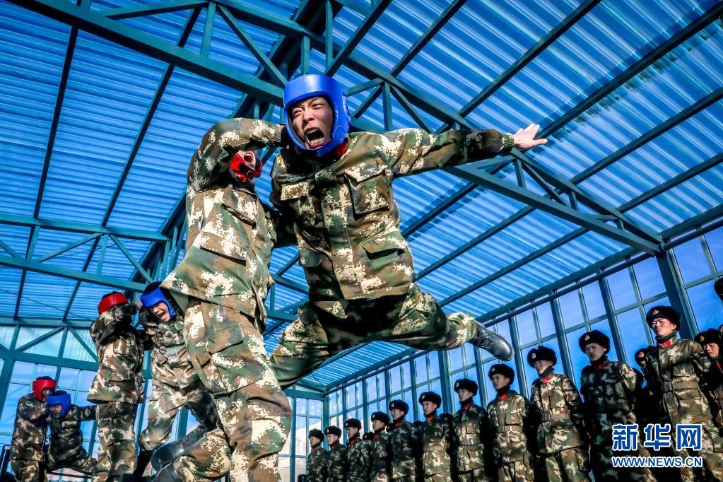 武警青海总队执勤支队执勤七中队官兵在训练馆训练(2月1日摄)。新华社发(杨浩 摄)